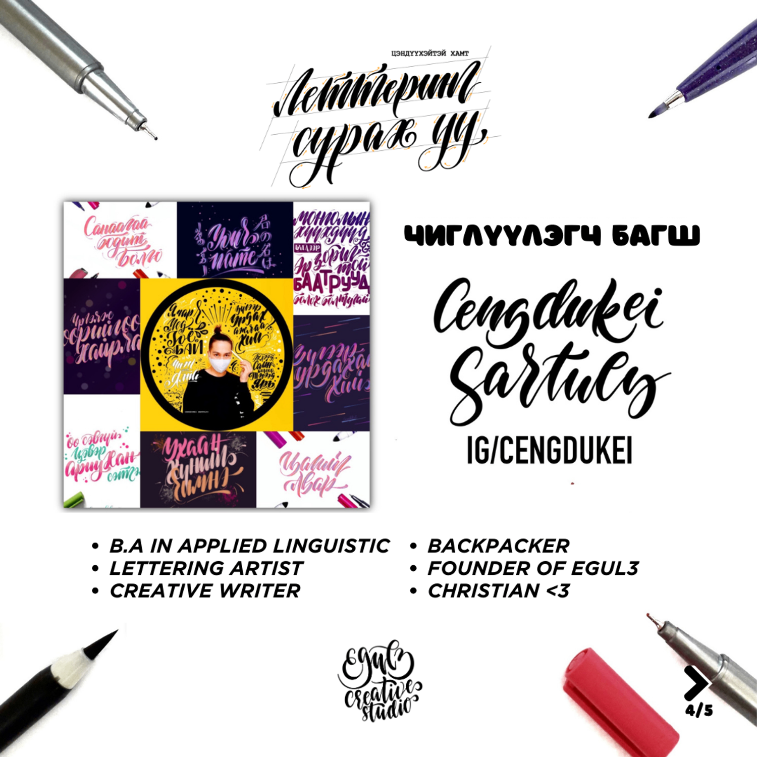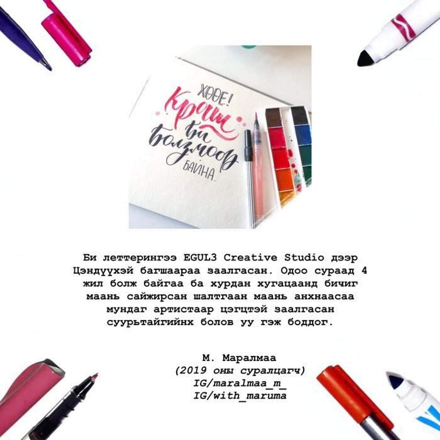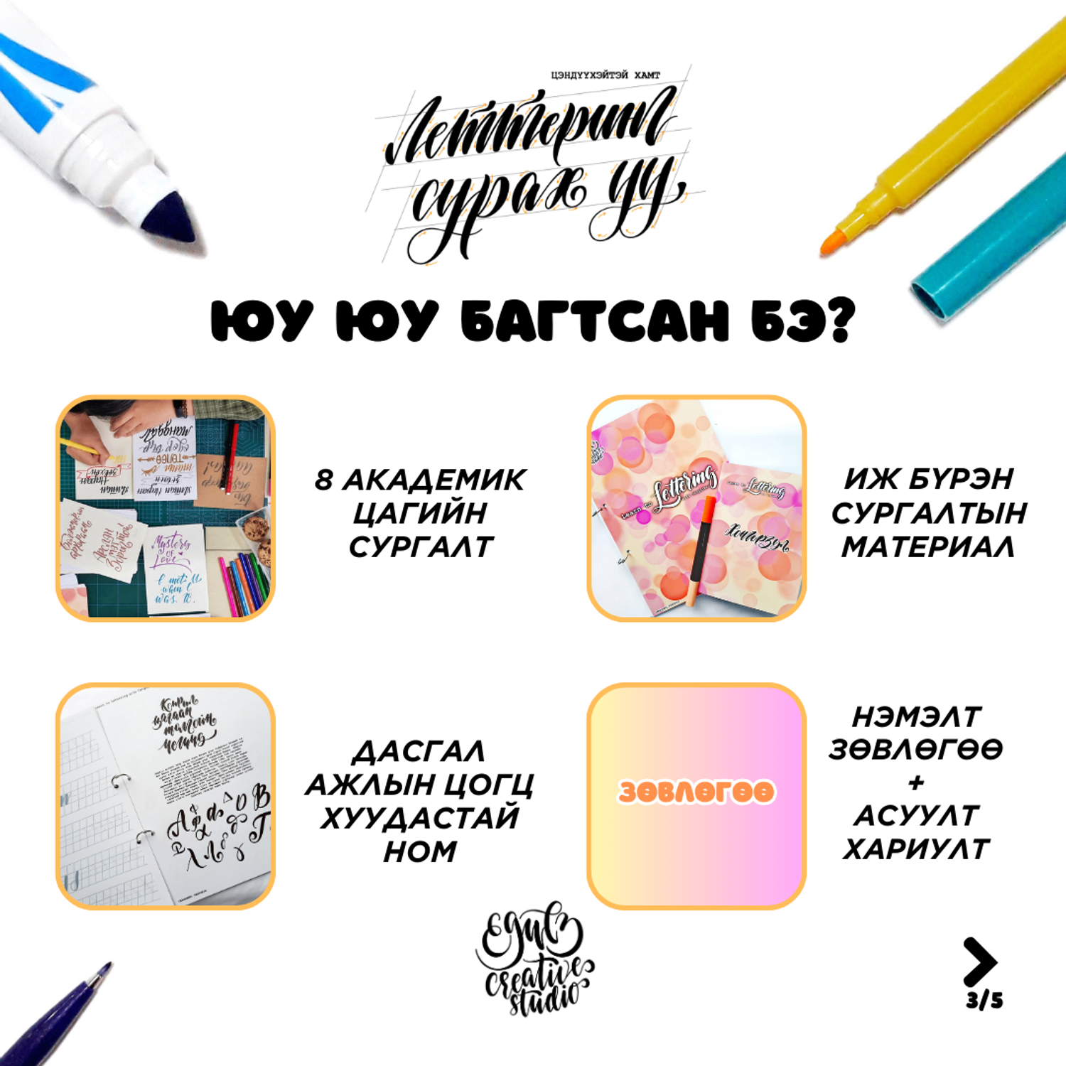 - Леттерингийн сурах бичиг, дэвтэр, бийрэн үзэг зэрэг сургалтын материалаар хангана.